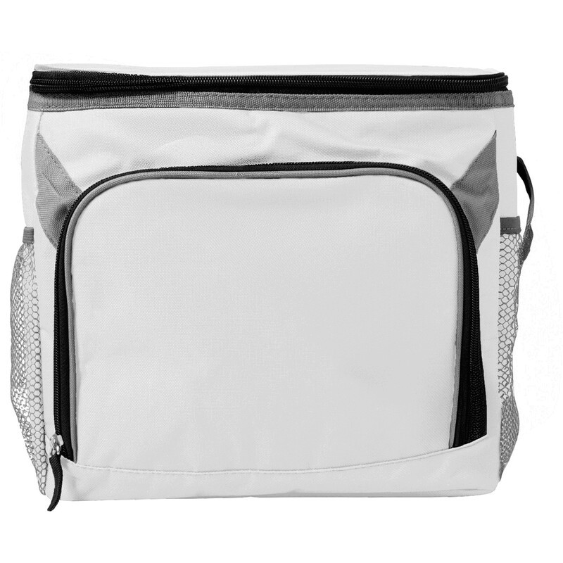 Rectangular cooler bag for 24 cans (0,33 l), zipped main compartment and front pocket, mesh pocket on both sides