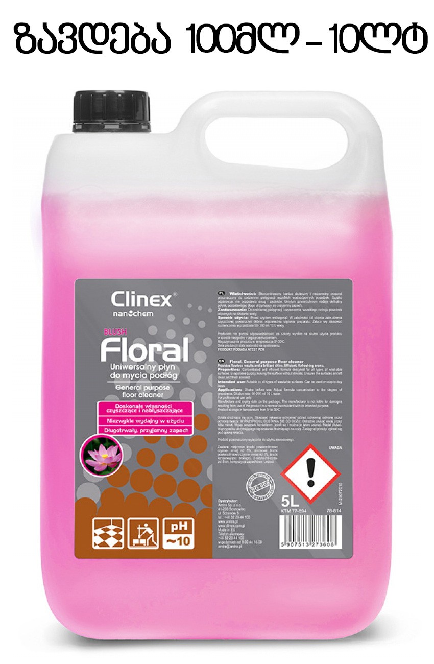The product is certified by the National Institute of Hygiene, ensuring its safety and reliability for everyday use. Clinex Floral is perfect for professional cleaning in high-traffic areas such as offices, hotels, restaurants, shopping malls, cinemas, theaters, educational institutions, and more.