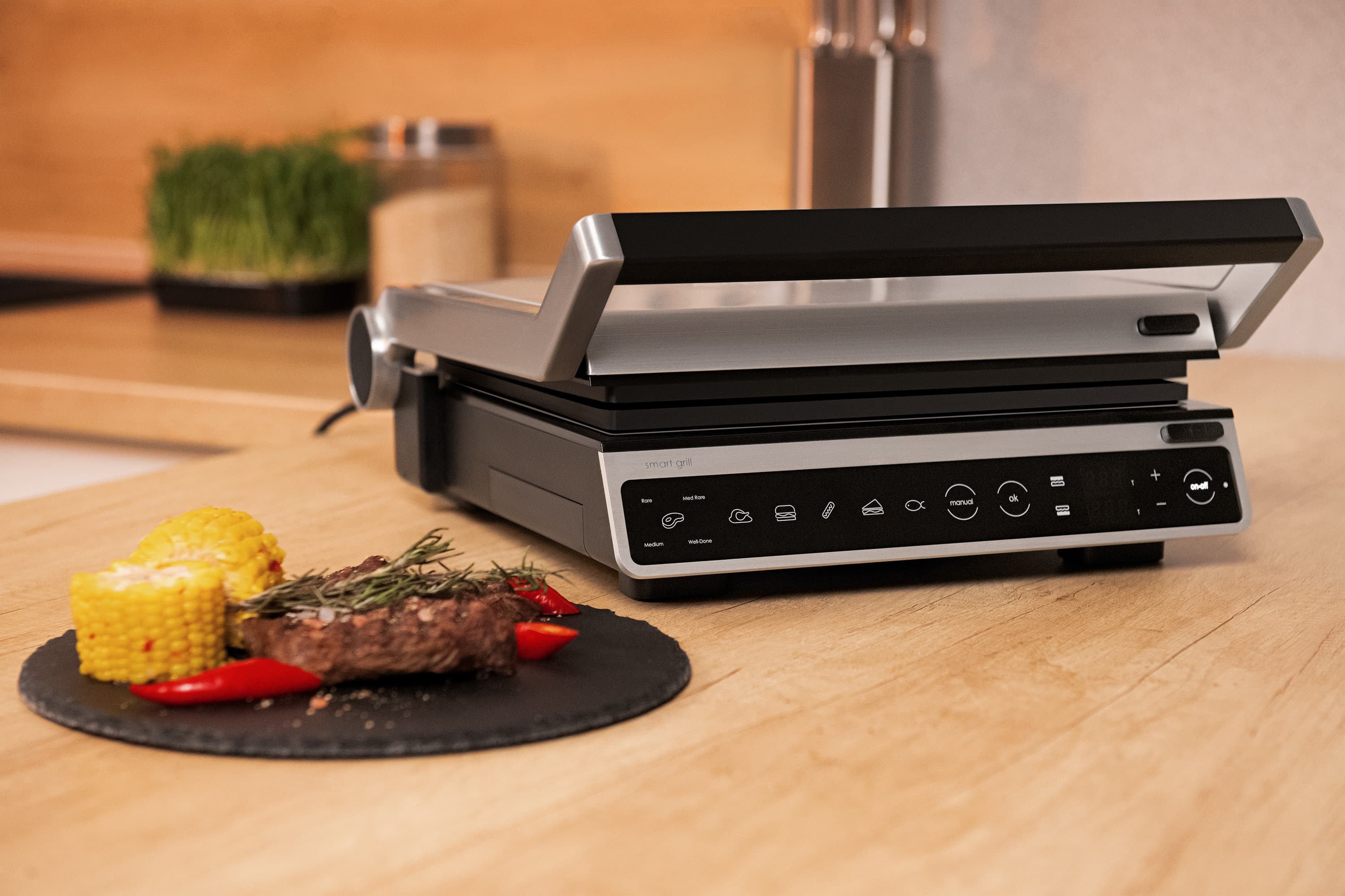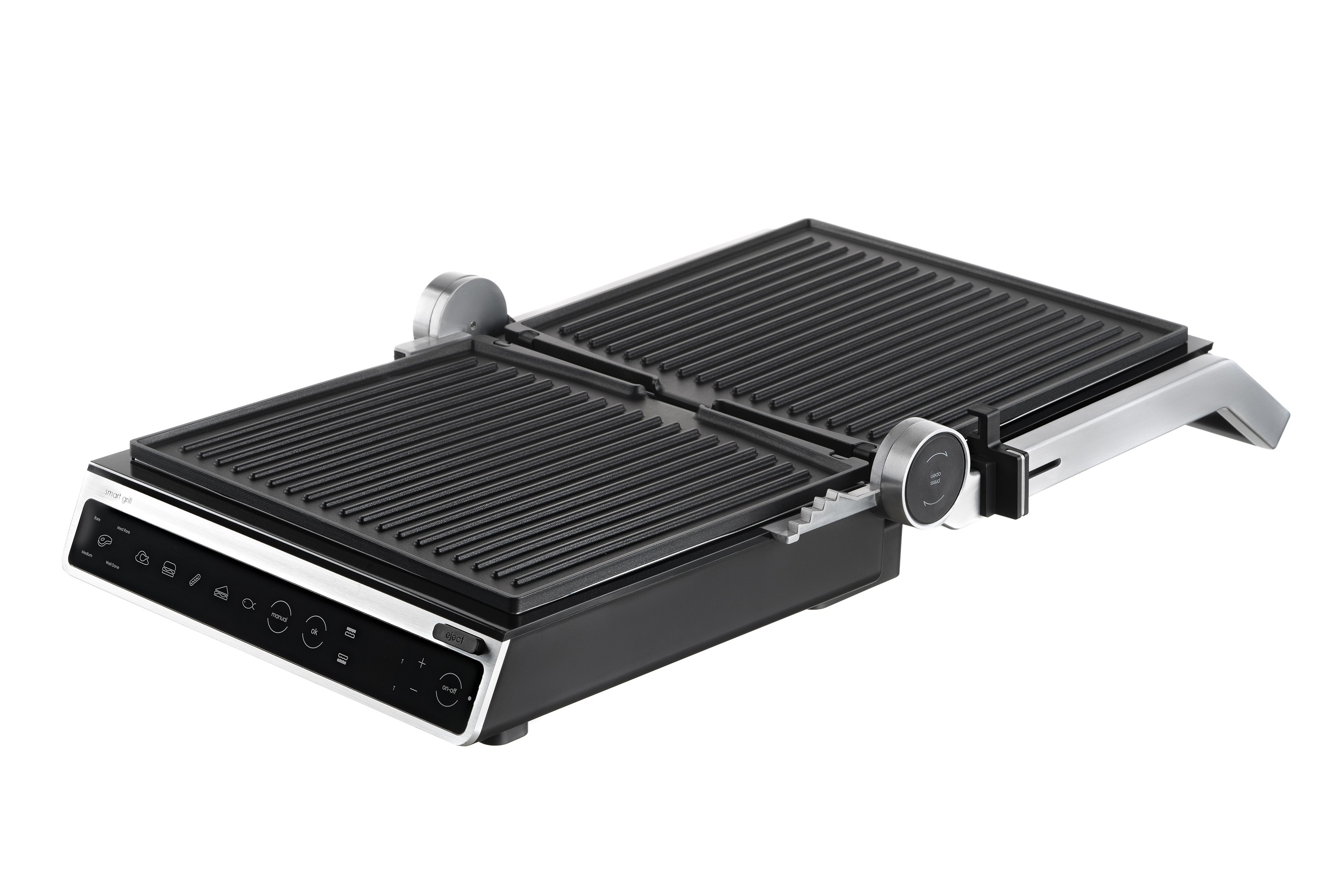 2000 ვატიანი ელექტრო გრილი, სენსორული კონტროლით, ექვსი ავტომატური მომზადების რეჟიმით, ტემპერატურის, შეწვისა და მზადყოფნის კონტროლით, ასევე პროდუქტის სისქის ავტომატური განსაზღვრით. გრილის ფირფიტების სრული გახსნა საშუალებას იძლევა ერთდროულად გამოიყენოთ ორივე ზედაპირი, ასევე იძლევა თითოეული ფირფიტისთვის ცალკე ტემპერატურის დაყენების შესაძლებლობას. მოსახსნელი არაწებოვანი საფარით დაფარული ფირფიტები და ცხიმისა და სხვა ნარჩენების შესაგროვებელი უჯრა მოწყობილობის გაწმენდასა და რეცხვას მოსახერხებელსა და მარტივს ხდის.