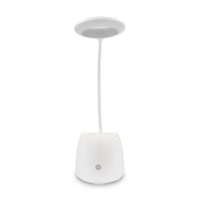 მრავალფუნქციური მაგიდის ნათურა მოქნილი დიზაინით და 3 სხვადასხვა განათების რეჟიმით. გააჩნია ჩაშენებული 1200 mAh ბატარეა, უსადენო Bluetooth 5.0 დინამიკი (3W), ტელეფონის სტენდი, კალმების ჩასადები და AUX შეყვანა. მარტივი ჩართვა/გამორთვა შეხებით ღილაკზე. კომპლექტში მოყვება micro USB დატენვის კაბელი. იდეალურია სამუშაო მაგიდისთვის, სასწავლო კუთხისთვის ან საძინებლისთვის.