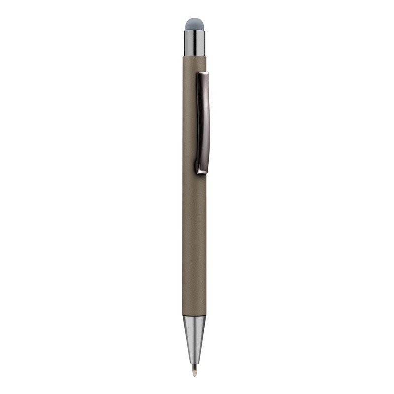Ball pen with coloured barrel, stylus tip enables touch screen operation, writes in blue, product made of aluminium