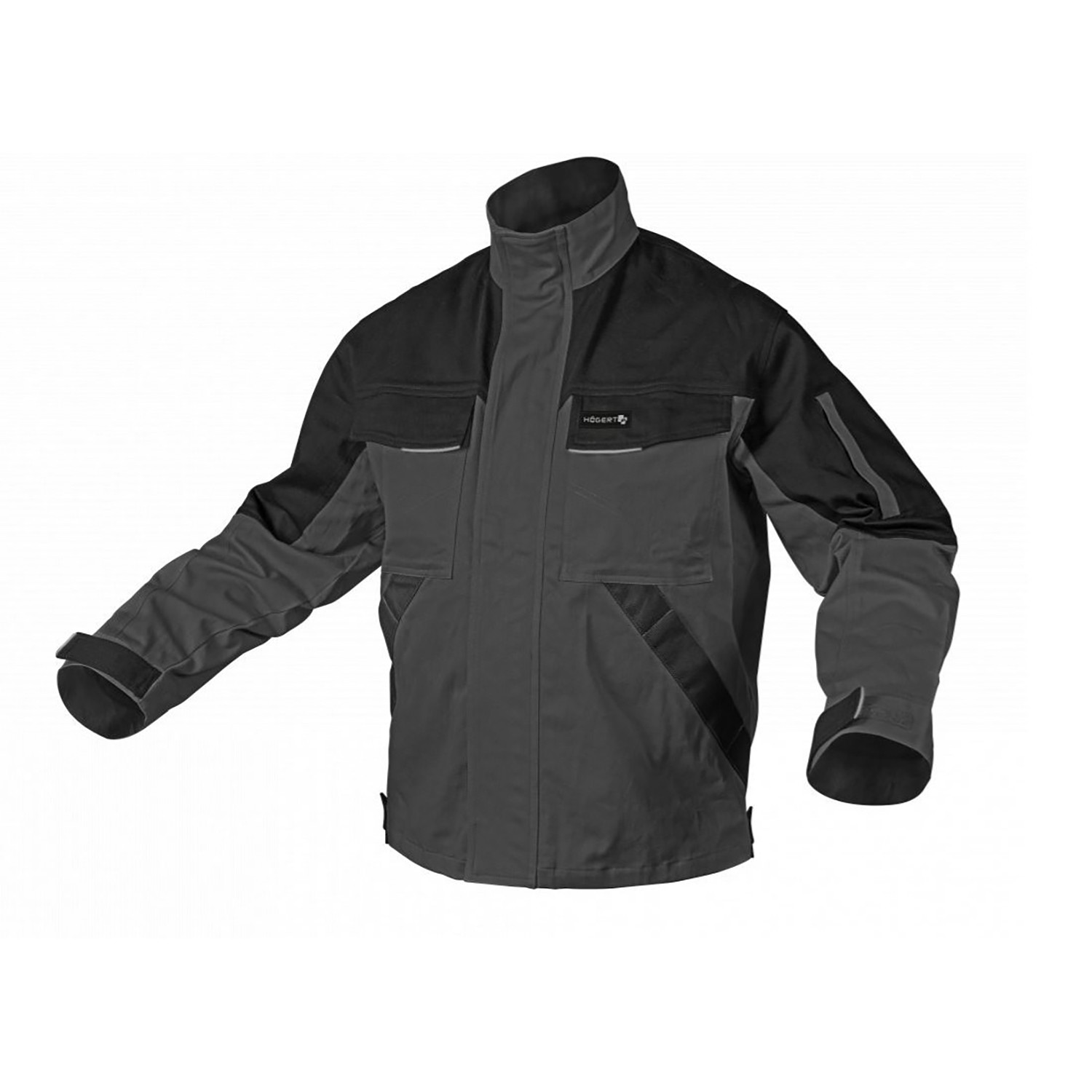 ნაცრისფერი სამუშაო ქურთუკი, იკვრება ელვა შესაკრავით, აქვს 5 ჯიბე და ამრეკლი ჩანართები წინა და უკანა მხარეს. მანჟეტებსა და წელის არეში არის რეგულირებადი.
