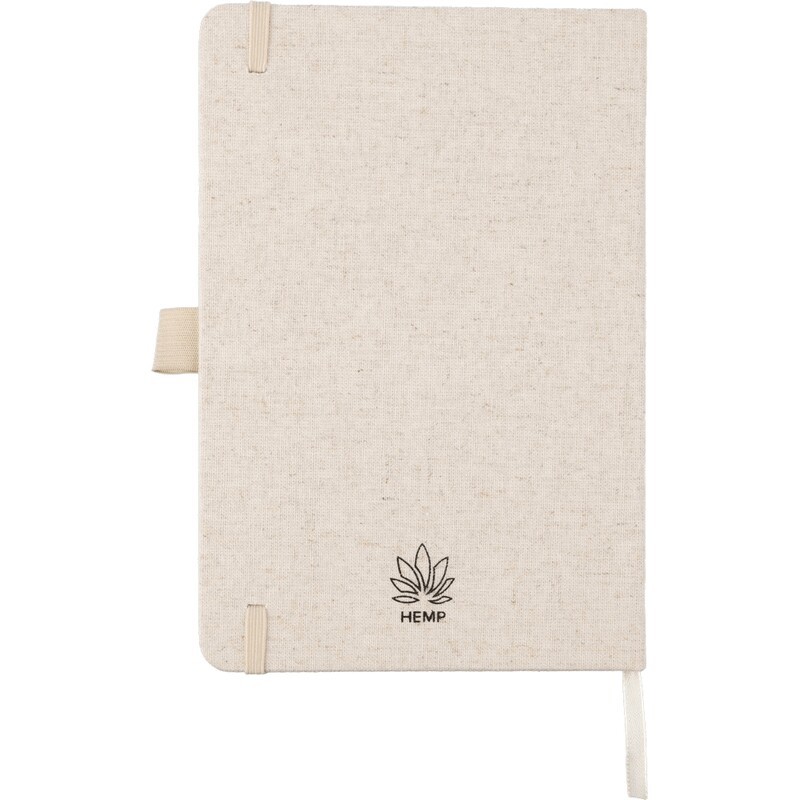 Notebook approx. size A5 with 80 lined pages, bookmark ribbon for easy marking of the last page or important notes, an extra elastic band closure in matching colour, features a pen loop, fits inside of a school backpack, includes hemp icon on product, product made from hemp